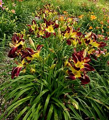 (N. Ripley 2007) Tet (Ruby Spider x Royal Celebration). Height 35”, flower 10”, 3-way to 4-way branching, bud count 12-18 (depending on rain), unusual form. Glowing Royal Garnet Red combined with chartreuse green throat can put a WOW in your garden. This flower has strong saturated colors that dazzle a painter’s eye. I love to paint watercolors and when I laid eyes on Scarlet Pimpernel I immediately wanted to put the brilliant colors and flower form on paper. Scarlet Pimpernel is often producing 4 petals and 4 sepals making 4 x 4 polymerous blooms. The flowers stand erect all day and do not fade, looking as fresh in the evening as in the early morning. When you add that Scarlet Pimpernel is a rebloomer and is both pod and pollen fertile, it is a gardener’s, collector’s, and hybridizer’s dream machine. Double fan, $30.00. Scarlet Pimpernel can be seen in the 2013, 2014, 2015, 2016, 2017, 2018, and 2019 National Gardens.